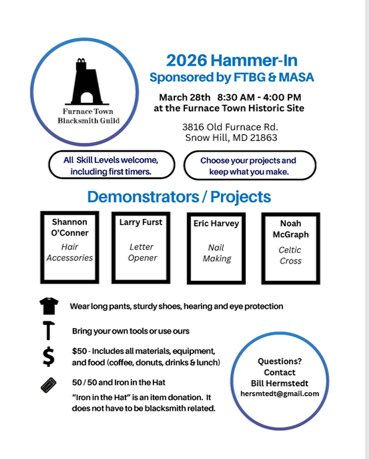 MASA/FTBG Joint Meeting Saturday, March 28, 2026 8:30 AM 4:00 PM Snow Hill, MD, 21863 United States (map) Google Calendar ICS The Furnace Town Blacksmith Guild is holding their 2026 Hammer In on March 28th, 8:30 - 4:00 at Furnace Town Historic Site, 3816 Old Furnace Road, Snow Hill, MD. All skill levels are welcome, including first-timers. Register/more information here: